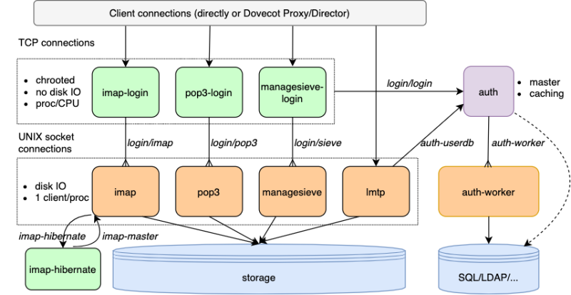 Логин процессы полностью обрабатывают SSL/TLS соединения. Они продолжают проксировать соединение к майл процессам в течении полного времени_жизни соединения. При таком способе, даже если будет найдена дыра в безопасности в SSL библиотеке, то аутентифицированный пользователь все еще не сможет выполнить код вне логин процесса.